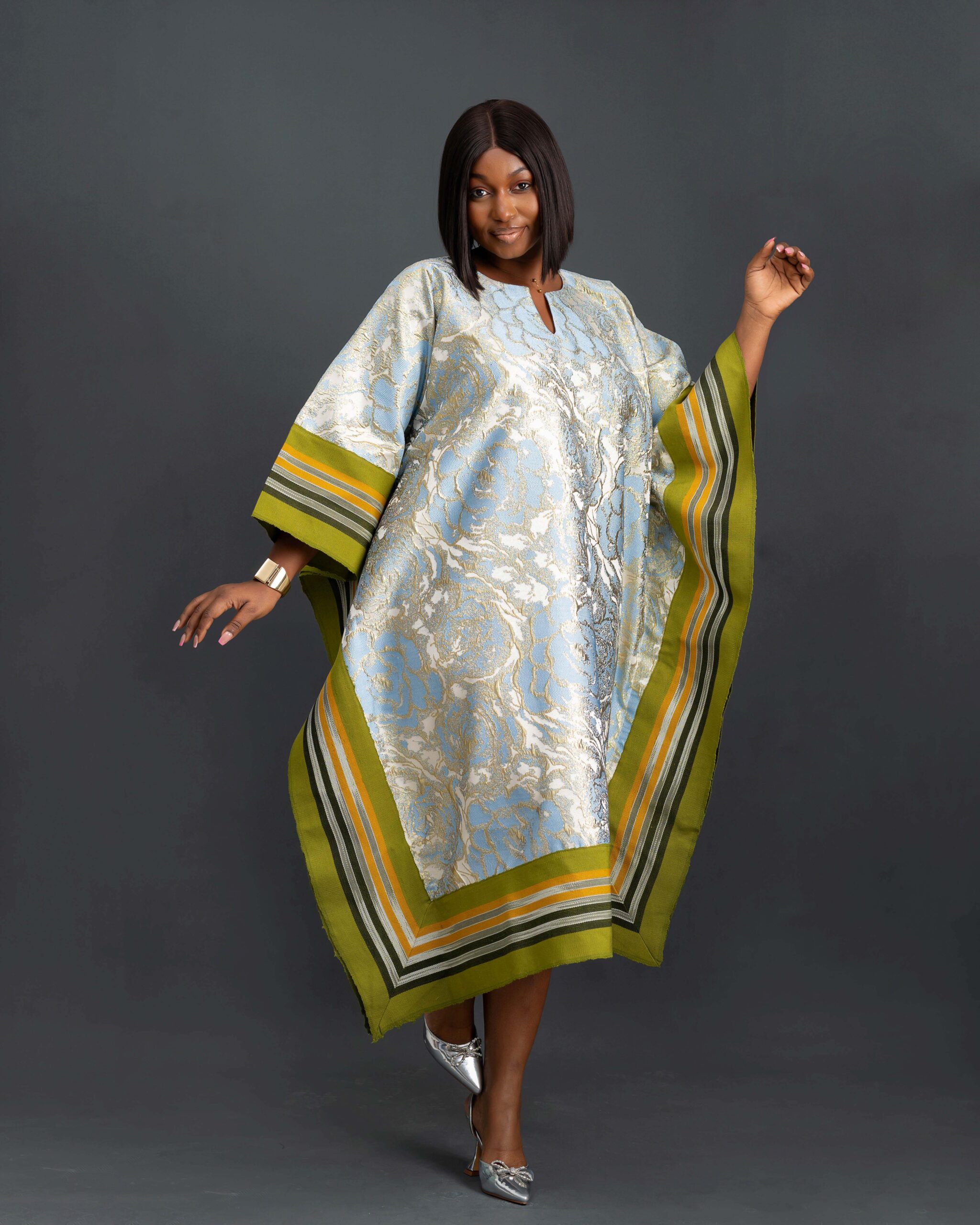 Biwakani midi length sky blue and gold damask paired with Aso.Oke bubu